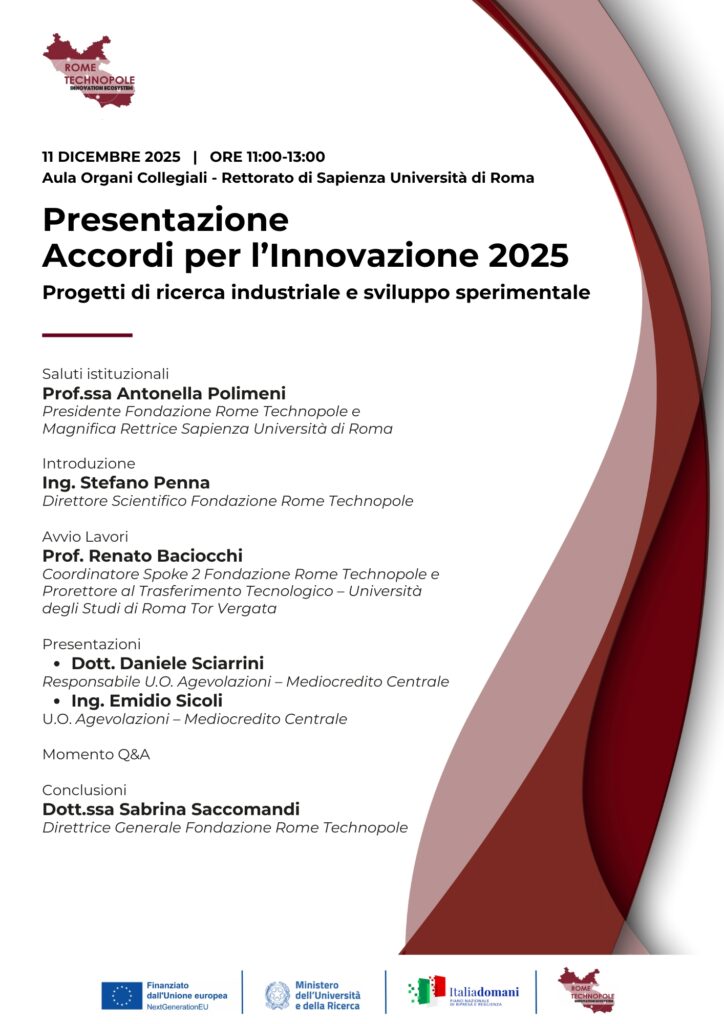 Giovedì 11 dicembre 2025 alle ore 11:00, presso l’Aula Organi Collegiali – Rettorato di Sapienza Università di Roma, si terrà l’evento di presentazione dell’Avviso “Accordi per l’Innovazione 2025 – progetti di ricerca industriale e sviluppo sperimentale” del Ministero delle Imprese e del Made in Italy, organizzato nell’ambito del Protocollo di Intesa tra Rome Technopole e Medio Credito Centrale, soggetto gestore dell’Avviso in parola.