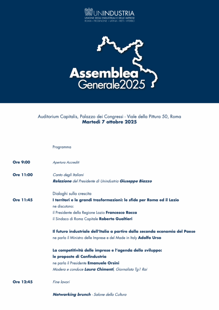 Il futuro del Lazio passa per l’Impresa e il prossimo martedì 7 ottobre 2025, al Palazzo dei Congressi di Roma – con accesso in viale della Pittura, 50 – torna il principale appuntamento istituzionale per il mondo imprenditoriale di Roma e del Lazio: l’Assemblea Generale di Unindustria (il programma è allegato).
