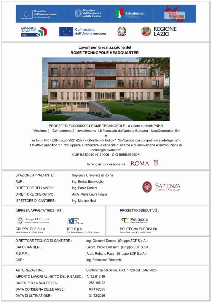 Venerdì 19 dicembre 2025 alle ore 11:00, presso Via delle Cave di Pietralata 101 – Roma, si terrà la cerimonia di posa della prima pietra dell’edificio Rome Technopole HeadQuarter e partirà così la realizzazione del quartiere generale di Rome Technopole, che ospiterà aule, laboratori e spazi comuni.