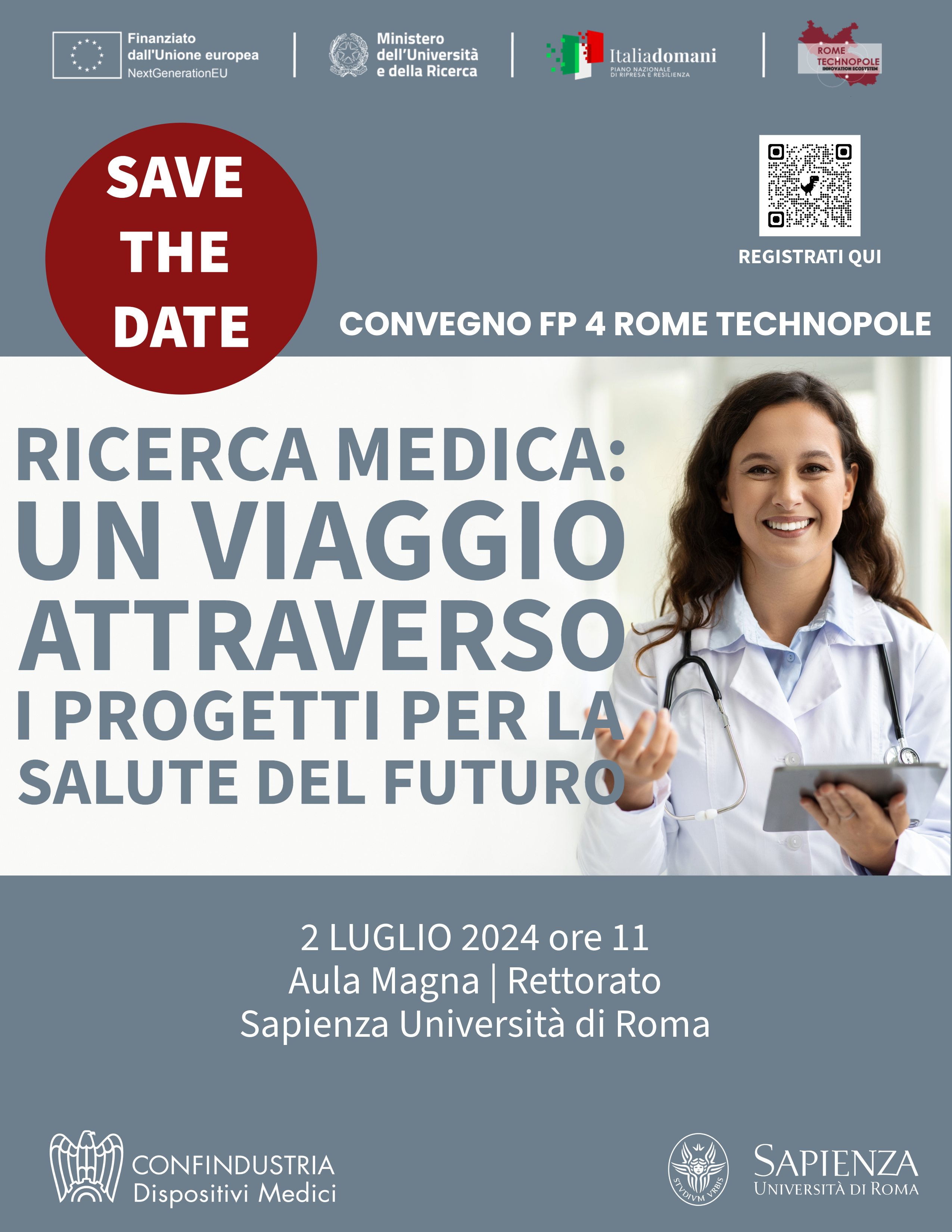 Martedì 2 luglio 2024 alle ore 11:00, presso l’Aula Magna del Rettorato di Sapienza Università di Roma, si terrà il convegno Ricerca medica: un viaggio attraverso i progetti per la salute del futuro, organizzato da Sapienza Università di Roma e Confindustria Dispositivi Medici, all’interno delle attività del Flagship Project 4 – Rome Technopole.