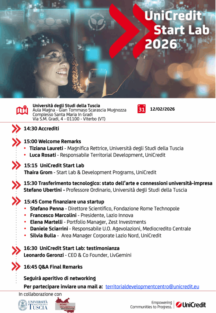 Siamo lieti di invitarvi alla terza tappa del Roadshow 2026 di UniCredit Start Lab, organizzata in collaborazione con il Rome Technopole e l’Università degli Studi della Tuscia.