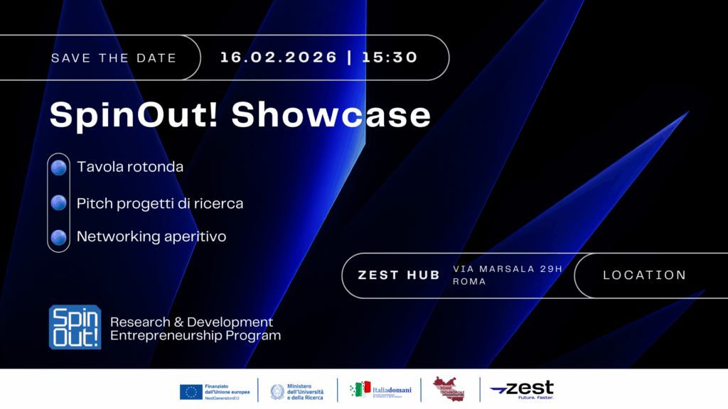 Il 16 febbraio 2026 si terrà l’evento finale di SpinOut!, uno showcase dedicato alla presentazione dei progetti di ricerca sviluppati nel percorso, rivolto a stakeholder, corporate e investitori, con momenti di confronto e approfondimento durante l’aperitivo di networking e le sessioni di speed date.